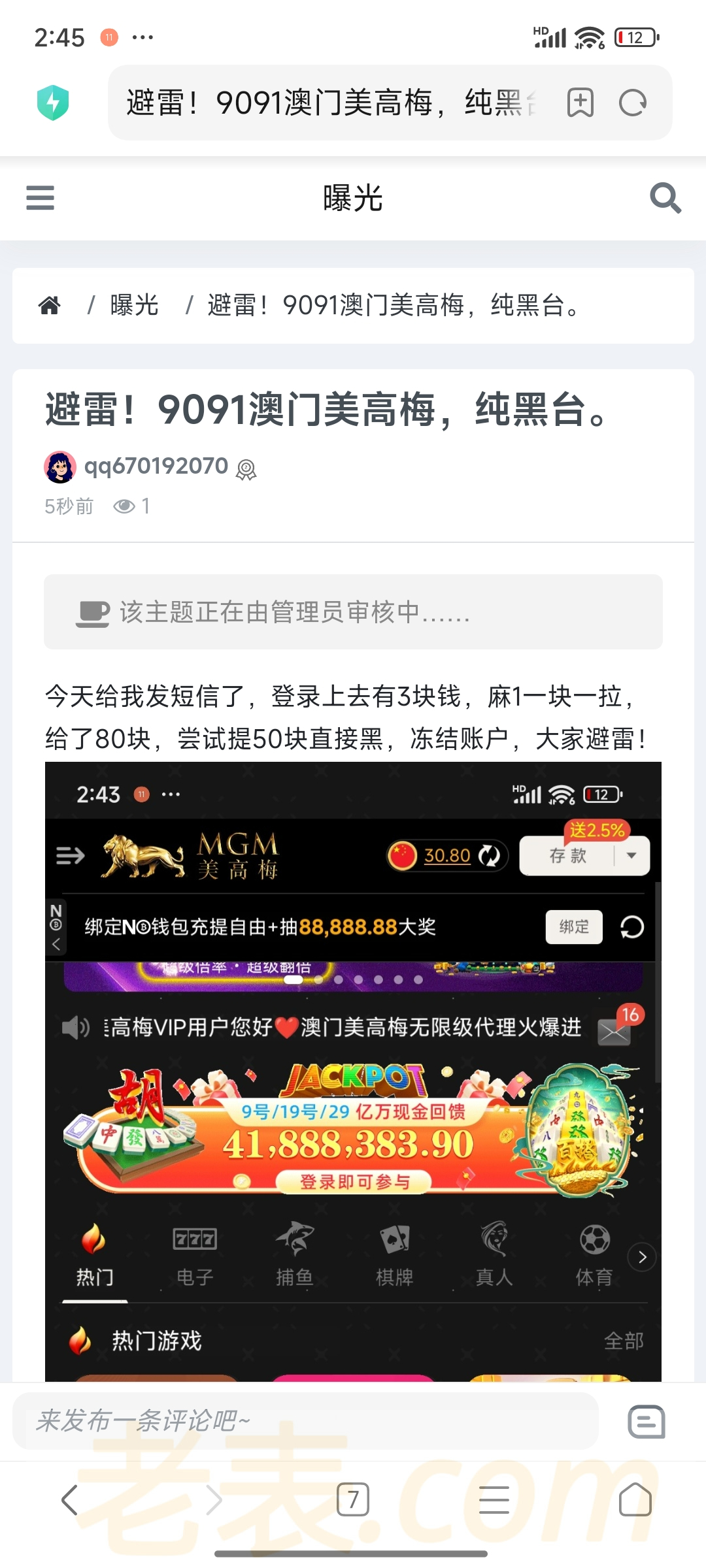 短信特邀送了彩金,提50块直接黑。隔壁论坛也曝光了。也是我发的。大家避雷。